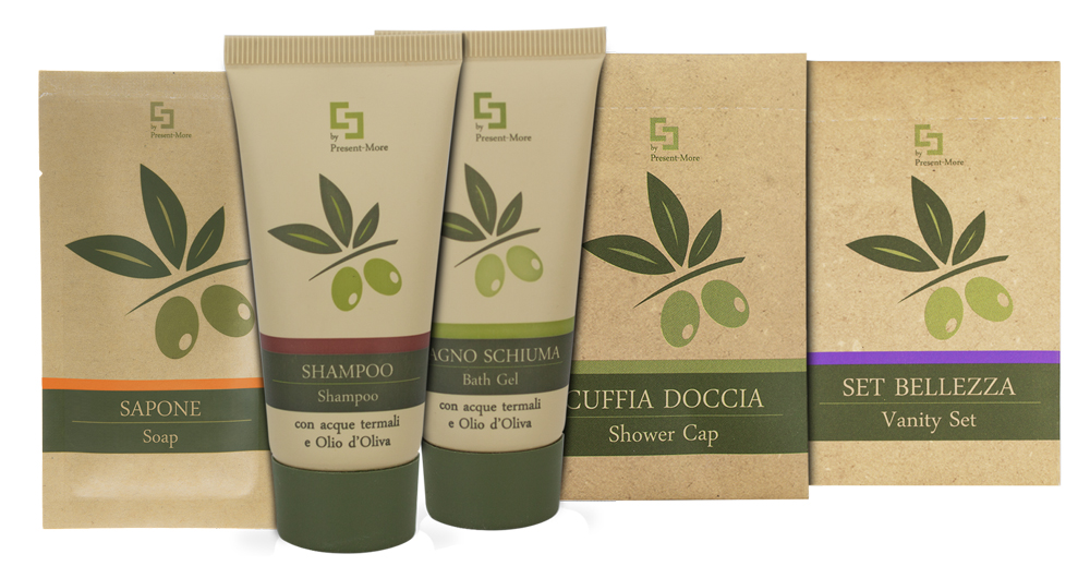 The kit includes a complete set of products in compact formats, ideal for stays and everyday use: 35 30 ml tubes of shampoo, 35 30 ml tubes of shower gel, 35 15 g soap bars, 35 shower caps, and vanity, all packaged in a small box. This composition makes the Beauty Oil Toiletries Kit for 20 Guests particularly suitable for efficient room replenishment.
