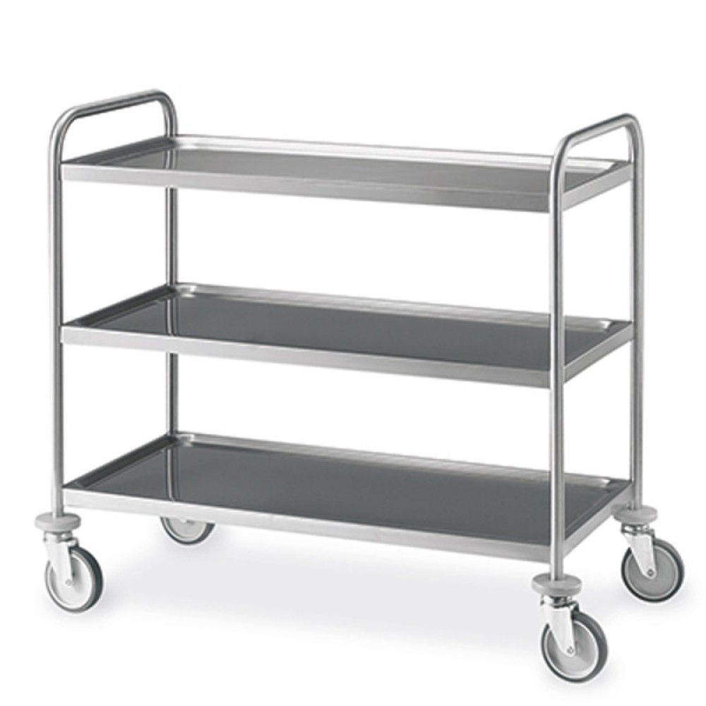 The 3-Tier Stainless Steel Heavy-Duty Cart is a professional solution designed to optimize the movement of materials and supplies in the hospitality industry. Thanks to its stainless steel frame and wheels, it allows you to conveniently and orderly move equipment, dishes, linens, or service products between kitchens, preparation areas, and workspaces. Its dimensions 109x69xh126 cm make it suitable for settings requiring a spacious yet manageable cart, ideal for daily use in busy environments.