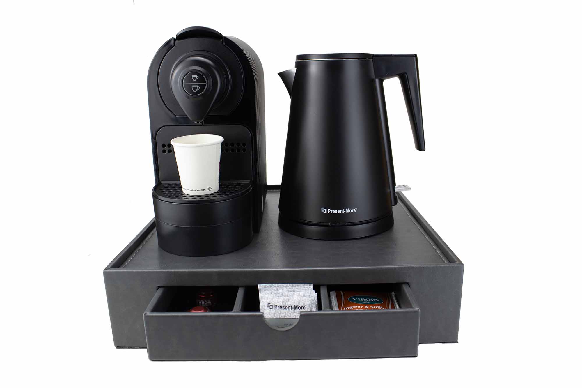 If you're looking for a black kettle tray and coffee machine set to provide essential beverage service in guest rooms, this solution is designed for use in professional environments such as hotels and B&Bs, with a focus on practicality, presentation, and organization.