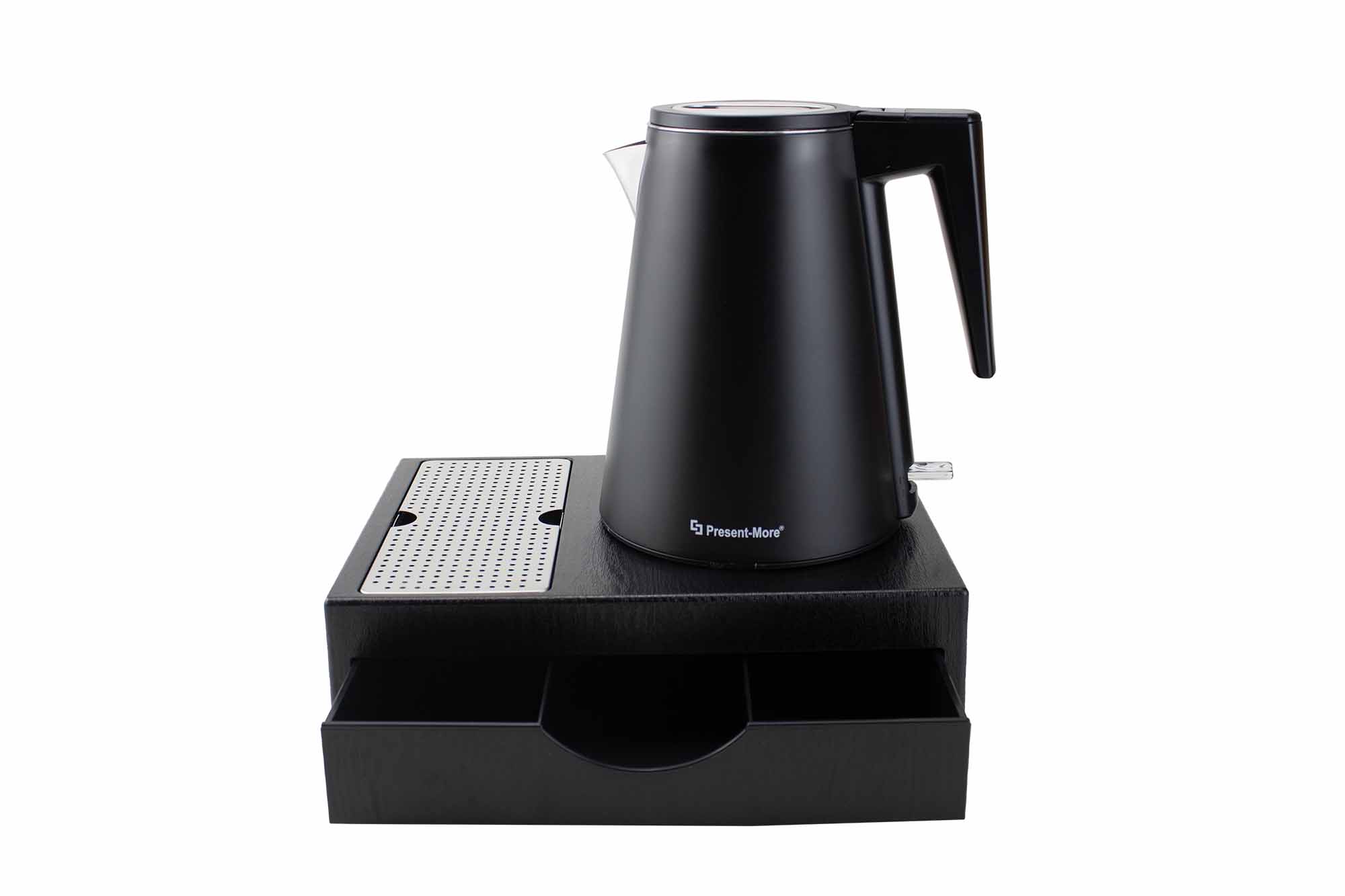 Thanks to its compact size and 0.8-liter capacity, the black tray and kettle set is suitable for everyday use in guest rooms, where practicality and efficient space management are key. The tray helps collect and securely position the kettle, making it easier to set up a tea and hot beverage corner, typical of hospitality supplies.