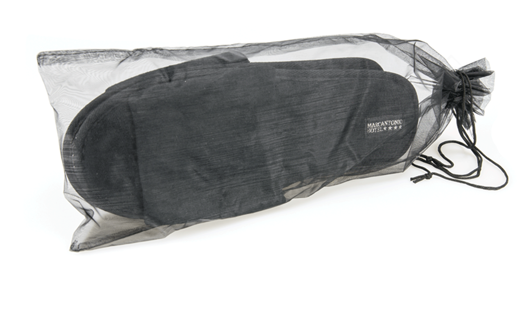 Dimensions 18x42 cm, the black tulle slipper bag is designed to comfortably hold slippers, making it suitable for the various operational needs typical of hotels, inns, and hospitality facilities. Its size also makes it particularly practical for managing disposable slippers and spa slippers, facilitating the preparation of courtesy sets and maintaining a clean and tidy presentation.
