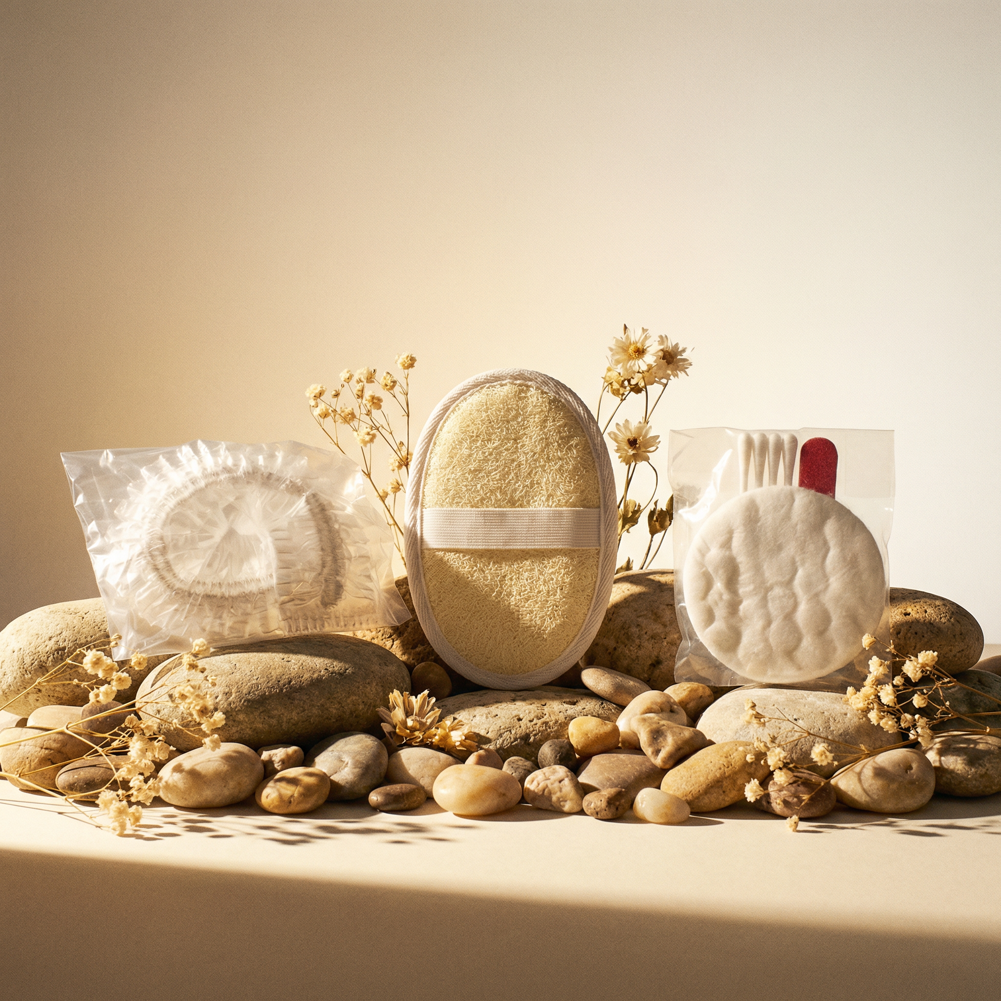The Ellipse Scrub Sponge is a disposable accessory designed for hospitality facilities and wellness centers that want to offer a simple yet premium skincare experience. Made of cotton and loofah, it combines softness and scrubbing action in a practical format and is individually wrapped to ensure hygiene and easy distribution throughout the room or changing area. Thanks to its elliptical shape, it is comfortable to hold during use in the shower or steam room.