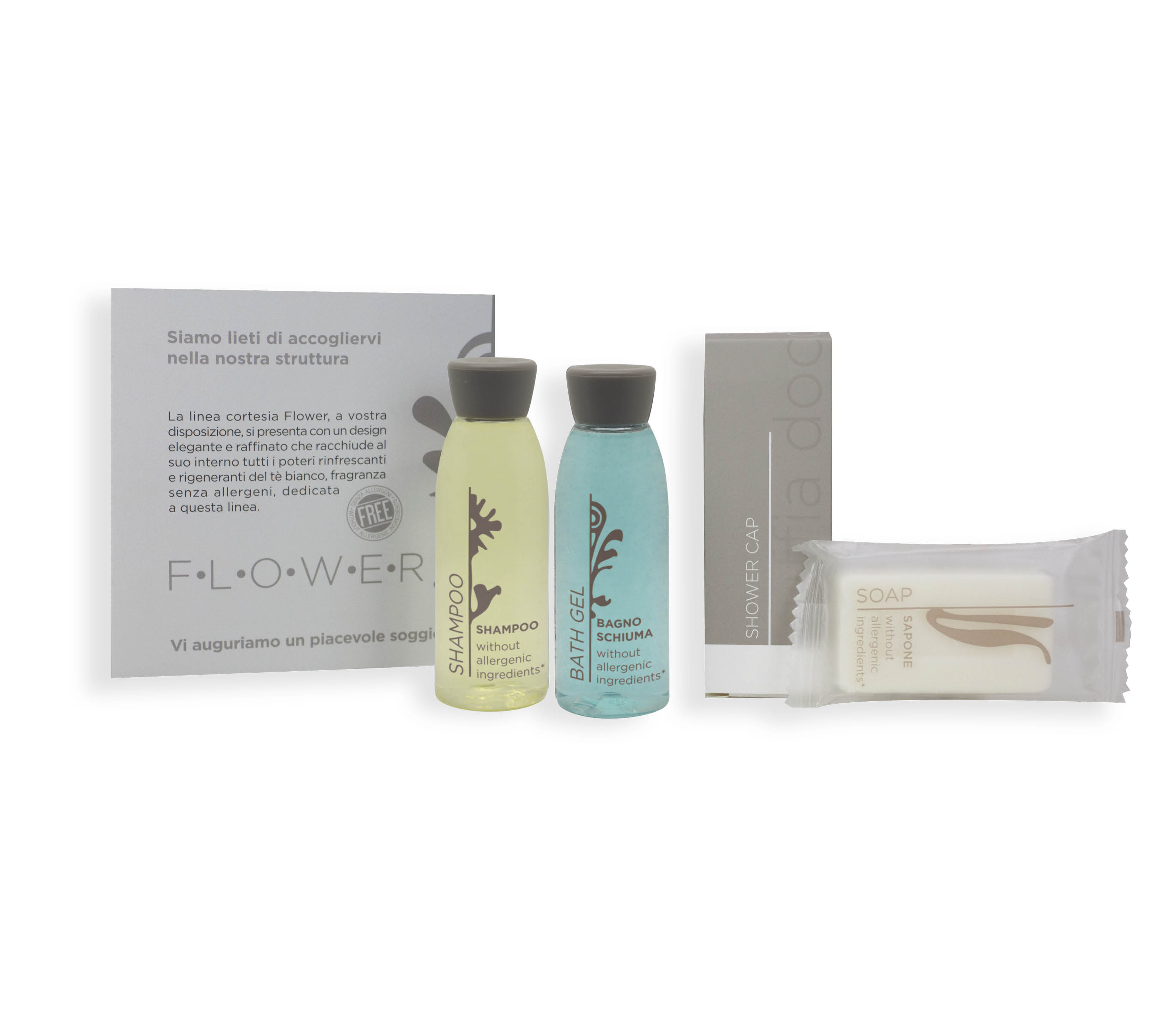 The Flower Courtesy Kit for 20 Guests in a Box contains a balanced composition for daily hygiene and comfort, ideal for short and medium-term stays. The kit includes: