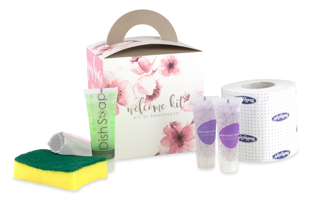 Each kitchen and bathroom welcome kit contains a selection of useful products for the daily maintenance of the room or accommodation: