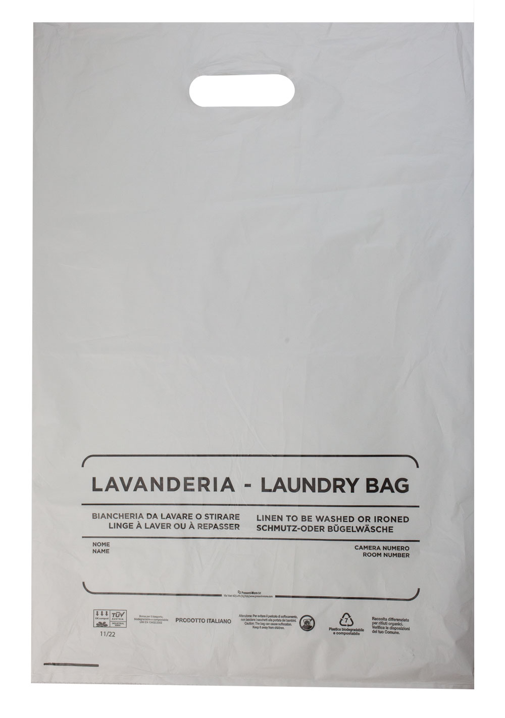 Made of compostable Materbi, the laundry bag is a solution in line with the needs of hospitality facilities focused on sustainability. The use of Materbi allows us to offer a service accessory that combines practicality and attention to materials, ideal for completing a simple and functional amenity line.