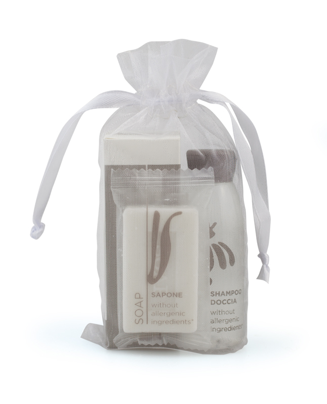 This composition makes the kit ideal as a complete courtesy solution, offering guests shower shampoo, soap, and a useful shower accessory, in a single set.