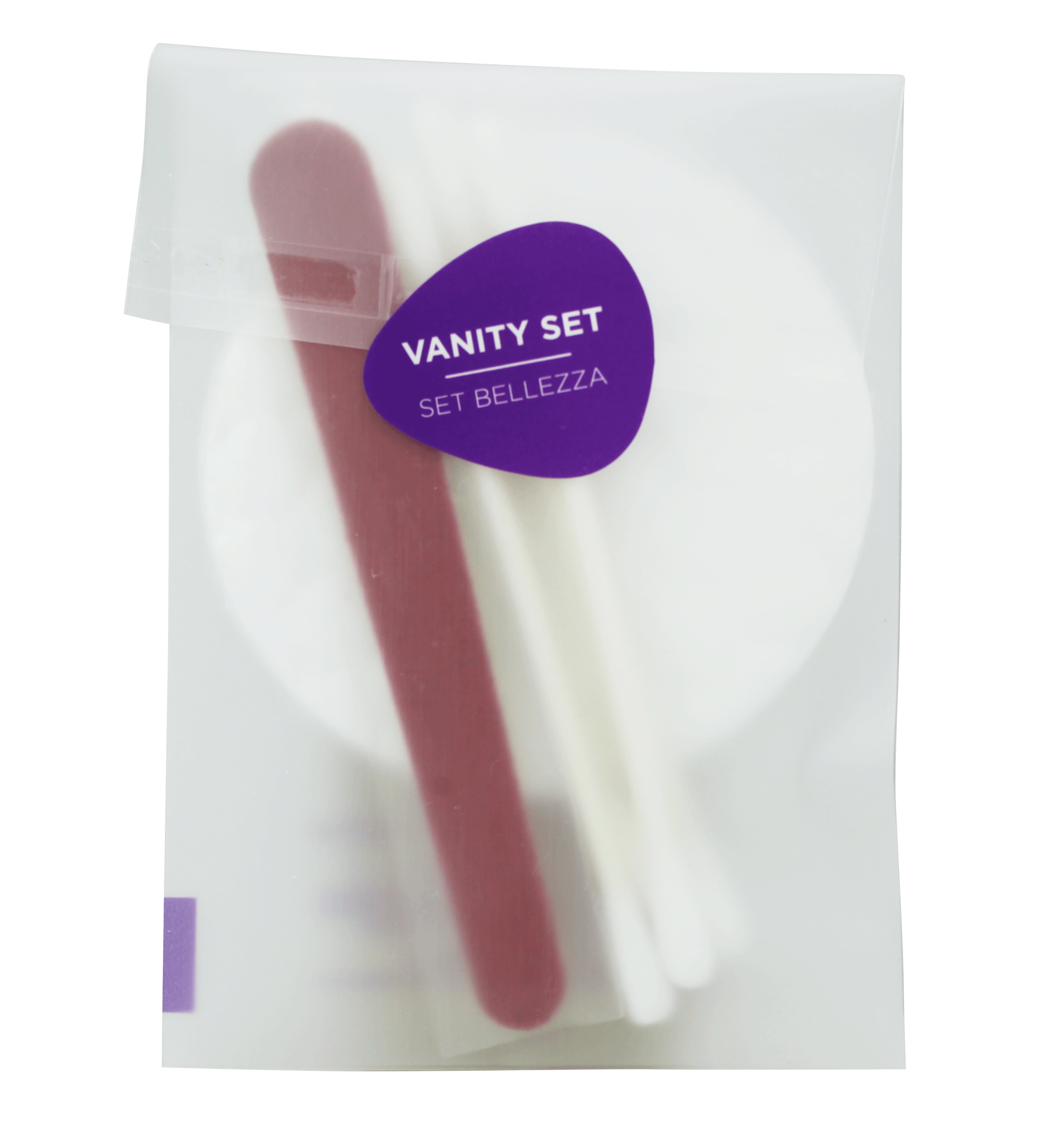 The set is packaged in a plastic sachet Recycled satin finish, a choice that contributes to a more pleasing and tidy presentation, while also facilitating in-room product management. The sachet protects the contents and allows for quick distribution by staff on each floor, maintaining hygiene standards and a higher perception of quality.