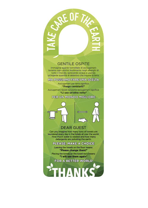 Cartellino da porta cambio biancheria, con taglio per essere adatto sia a porte con maniglia classica, sia a porte con pomo, tradotte in quattro lingue, ideale per hotel b&b e strutture ricettive