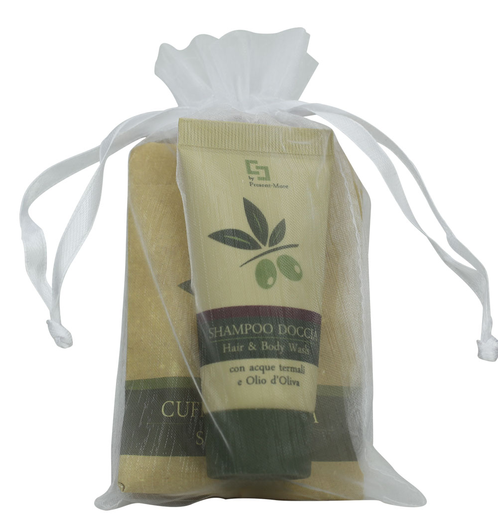 Prestige kit linea Beauty Oil. ogni sacchetto contiene: 1 Shampoo Doccia 30ml Beauty Oil MADE IN ITALY senza SLES, OGM, e PARABENI Fragranza TAHITIAN SENZA ALLERGENI, 1 Sapone 15g Beauty Oil Fragranza TAHITIAN SENZA ALLERGENI e 1 Cuffia doccia in busta ideale per hotel e strutture ricettive