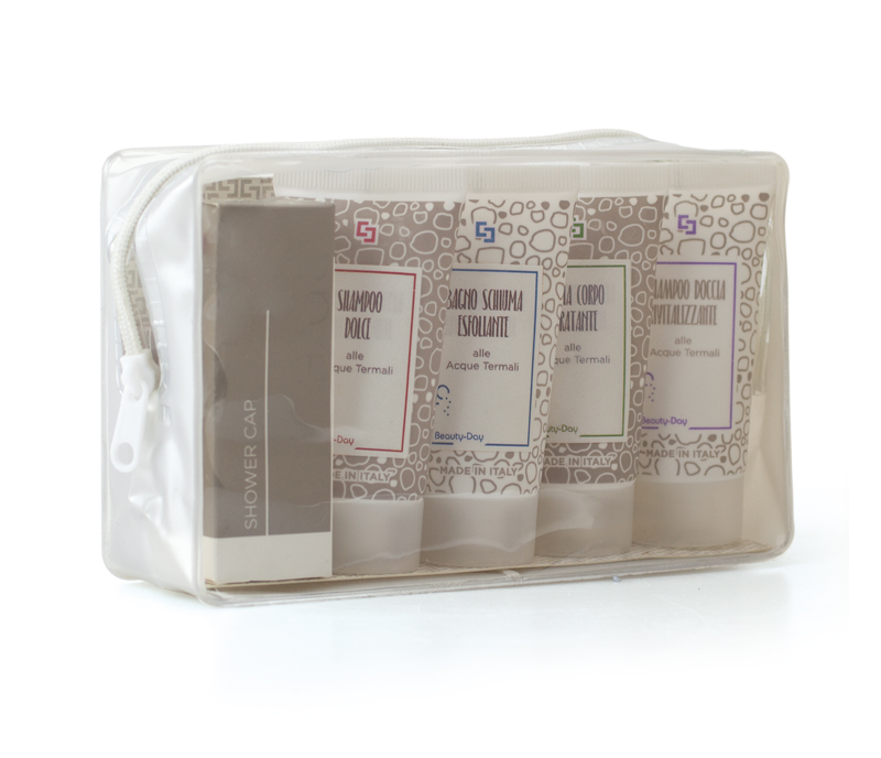 Kit cortesia completo in pochette in pvc, con 7 prodotti monouso Beauty-Day